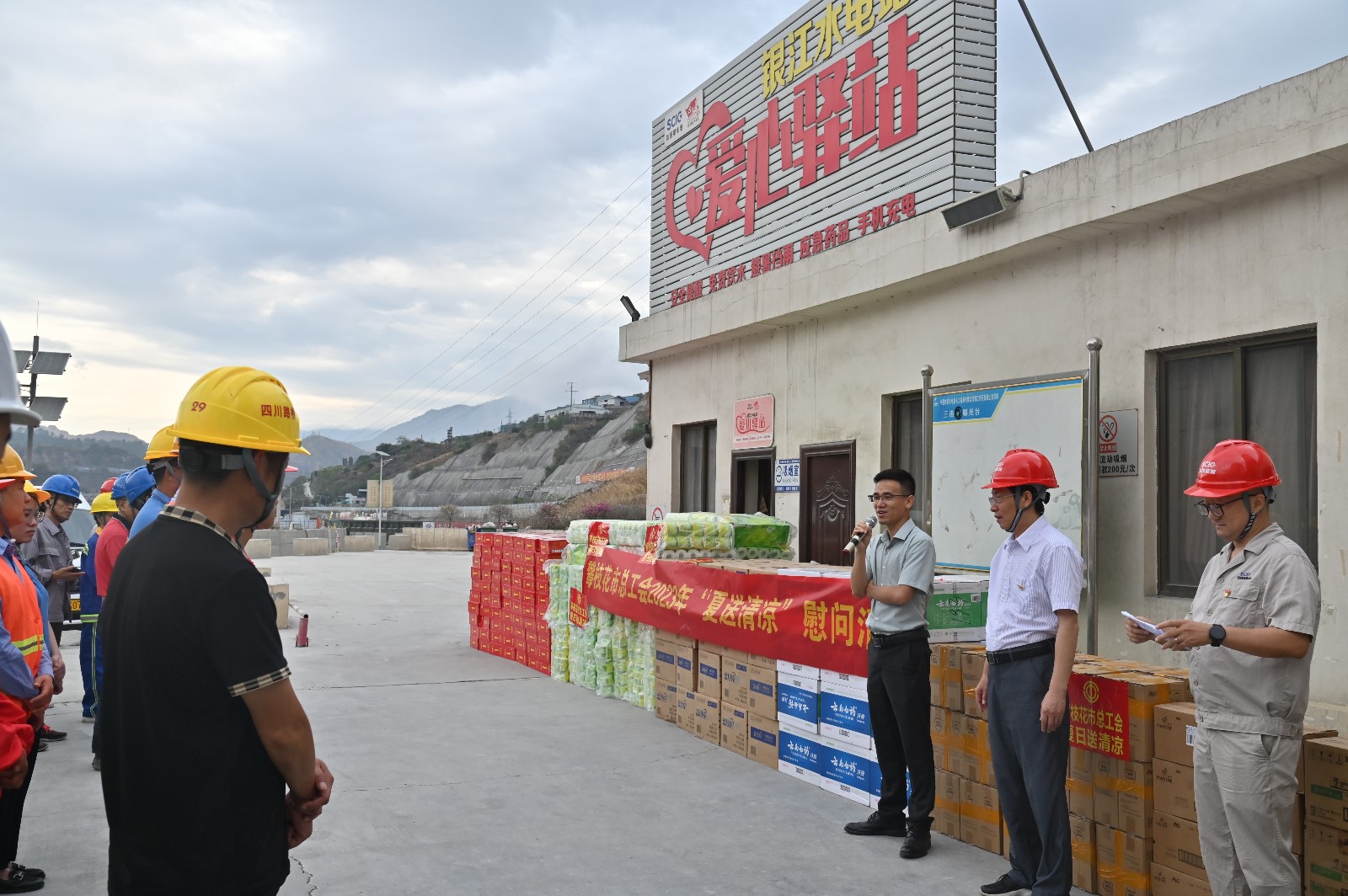 近日,攀枝花市氣溫連續突破40℃,各級工會主動作為、多措并舉推進防暑降溫工作,切實維護職工群眾安全健康權益,在銀江水電站“愛心驛站”,張平向奮戰在一線建設者們表示深深的敬意和誠摯的慰問,叮囑大家在保證工作質量、工作進度的前提下,注重自身安全,做好勞動保護,防止高溫中暑。并為長江設計、貴陽院監理、二灘建設監理、華東院監理、水電五局、水電七局、廣東源天等20家參建單位的工友代表,送上了清涼飲料、沐浴露、洗衣液、防暑藥品等500份防暑降溫清涼物資,為頂著烈日高溫堅守崗位,辛勤勞作的一線工友們送上一份清涼和關懷。