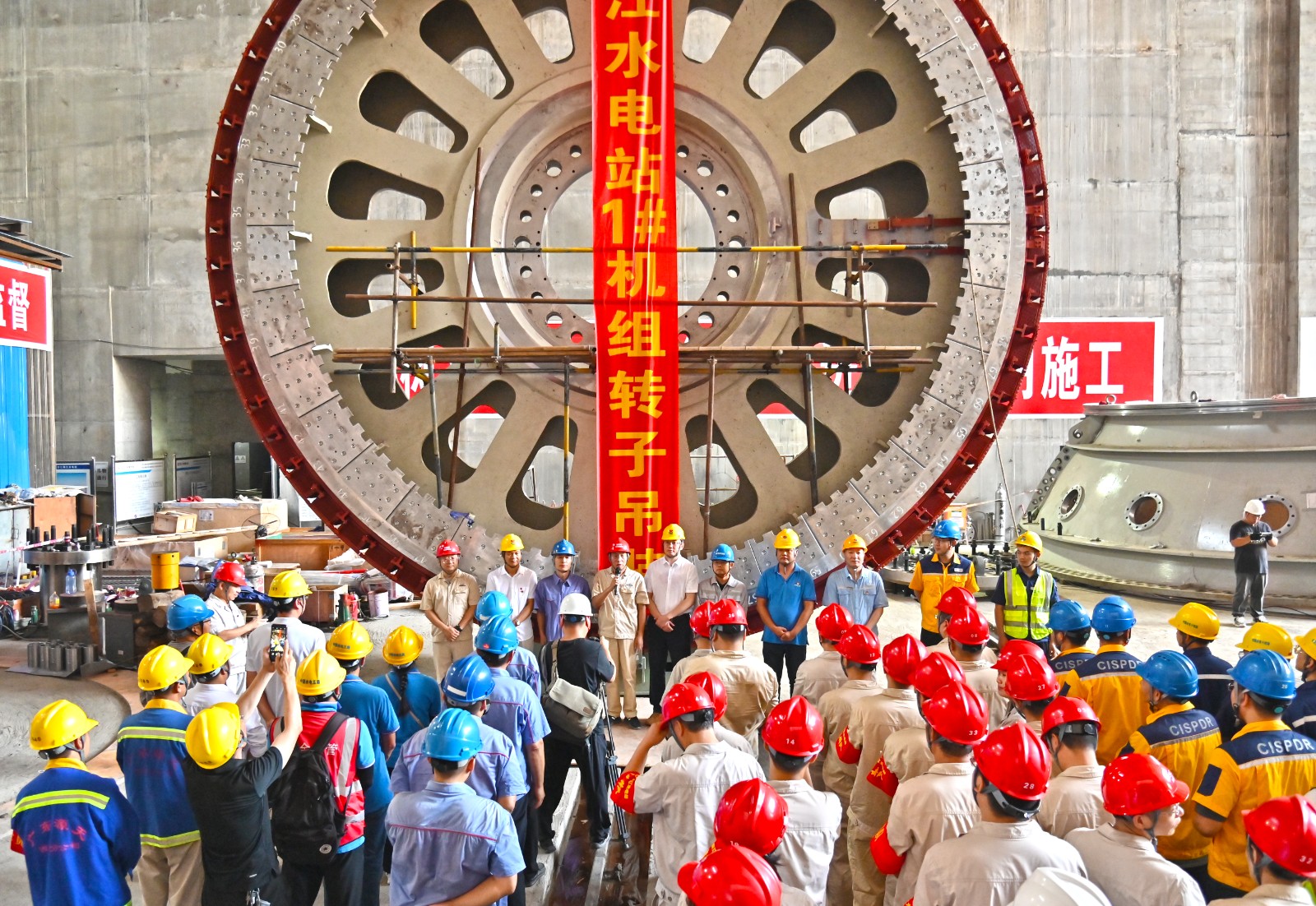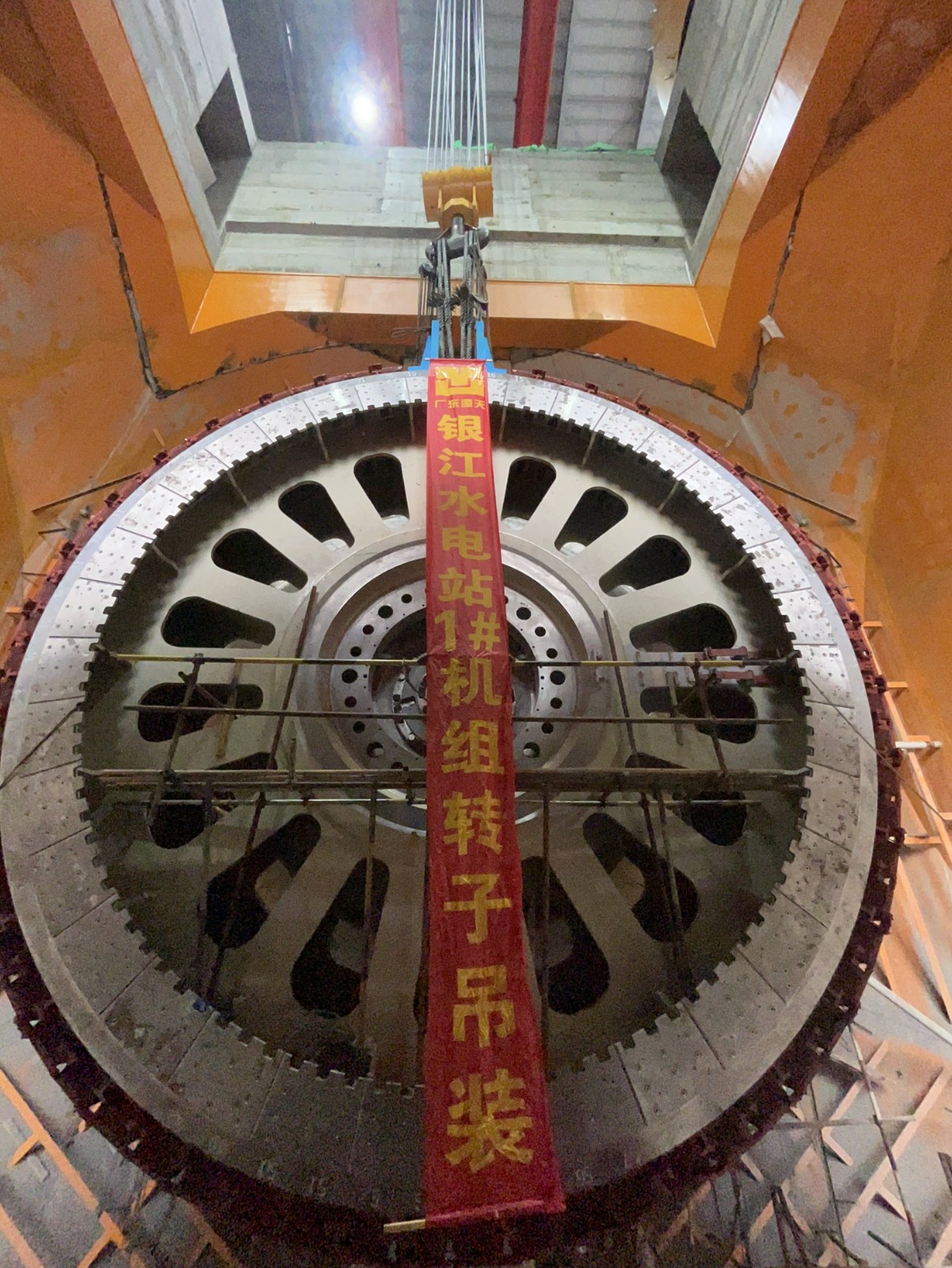 8月25日下午,銀江水電站首臺機組轉子順利吊入機坑并與機組主軸連接就位。