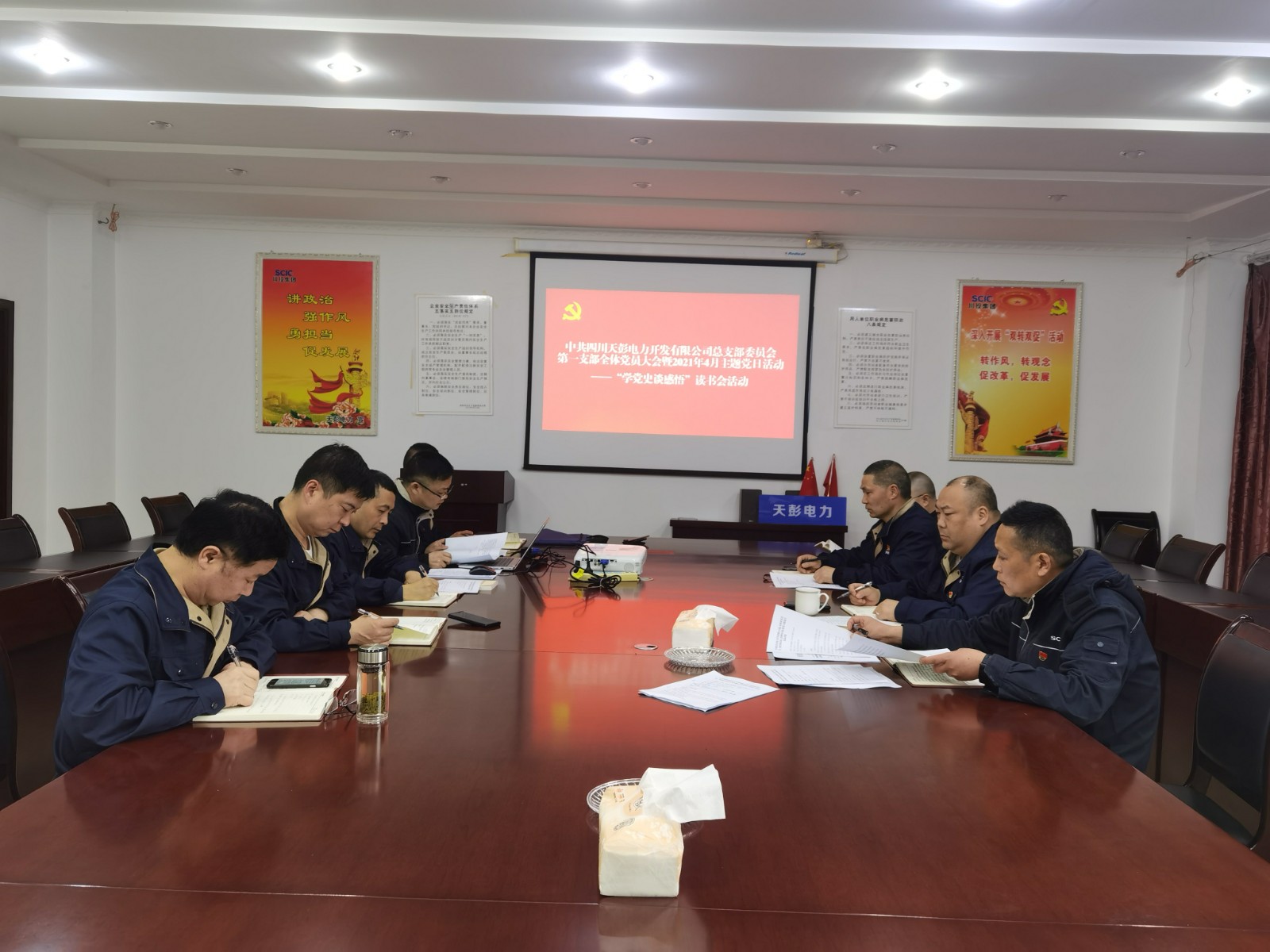 4月29日上午,天彭電力黨總支在公司二樓會議室召開2021年第4次中心組學習(擴大)會暨黨史學習教育專題讀書會,公司領導、各支部書記參加會議,會議由黨總支書記、總經理陳忠主持。