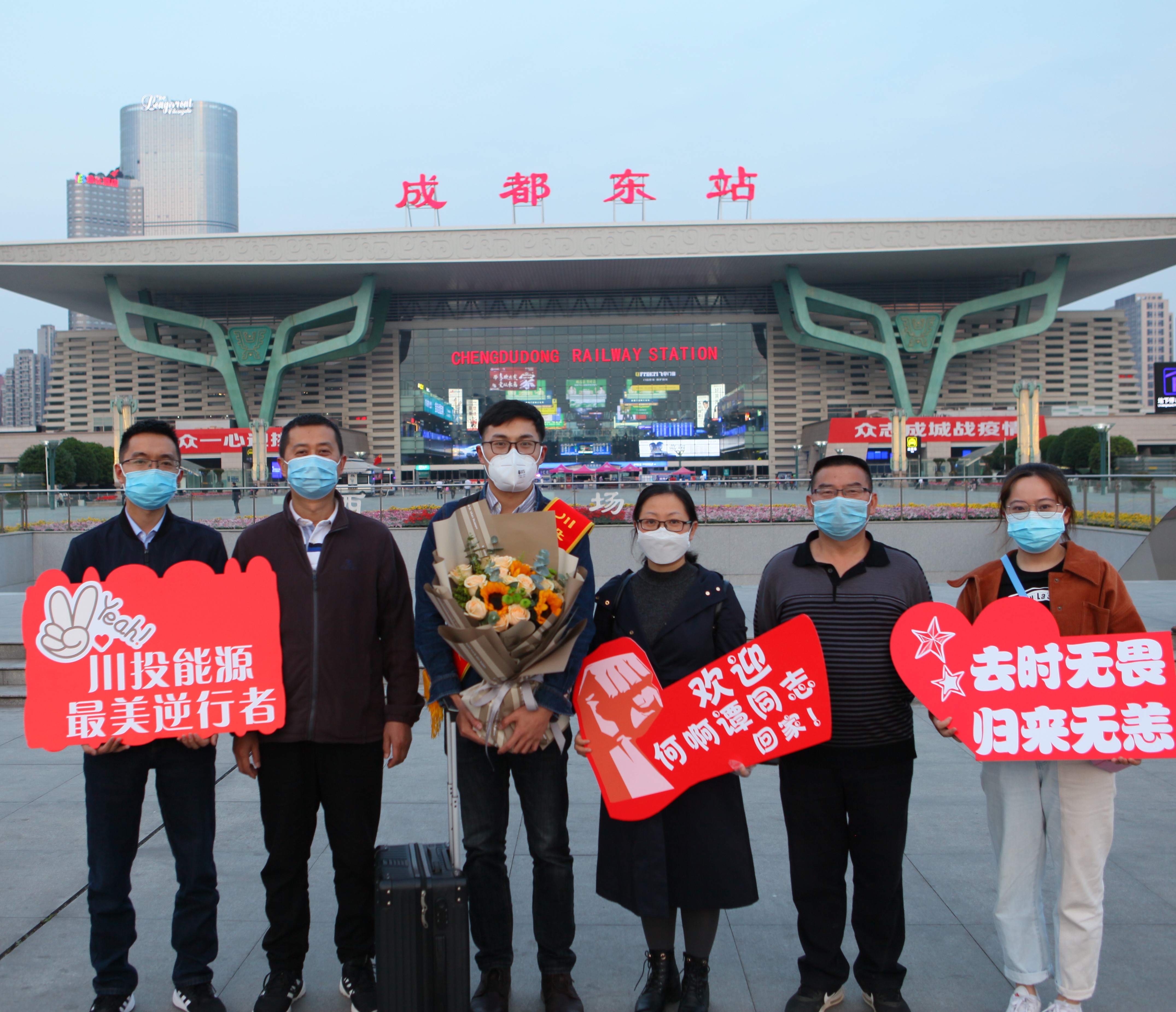 4月25日,川投能源 “最美逆行者”、交大光芒工程突擊隊隊員何啊潭同志圓滿完成在武漢鐵路局的值守任務,帶著勝利和平安凱旋歸來。川投能源黨委副書記、工會主席楊超龍與黨群工作部主任楊鑫以及交大光芒黨總支委員汪志橋一道,手捧鮮花,到成都東站迎接川投能源“最美逆行者”回家。